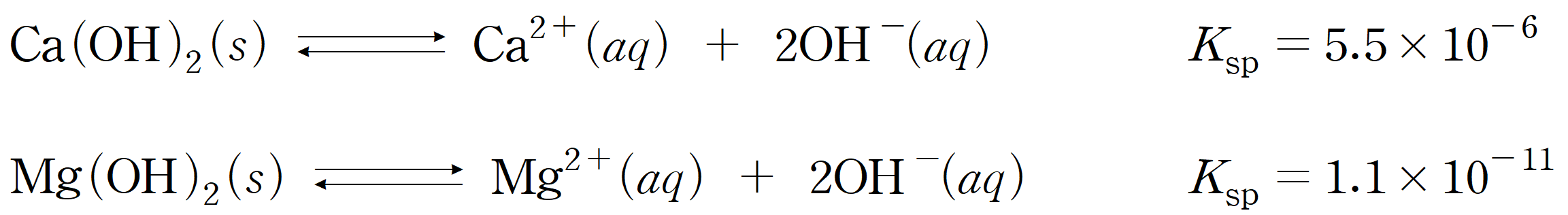 (a) 두 침전의 용해도곱상수 Ksp를 비교해 보면, Mg(OH)2 < Ca(OH)2로 Mg(OH)2의 용해도곱 상수가 작고, 용액 내 포함된 금속 이온의 농도도 Mg2+ > Ca2+이기 때문에, Mg(OH)2가 Ca(OH)2 보다 먼저 침전될 것을 예상할 수 있다. 용액 내 Q > Ksp 를 만족하면, 침전물이 생성되므로,