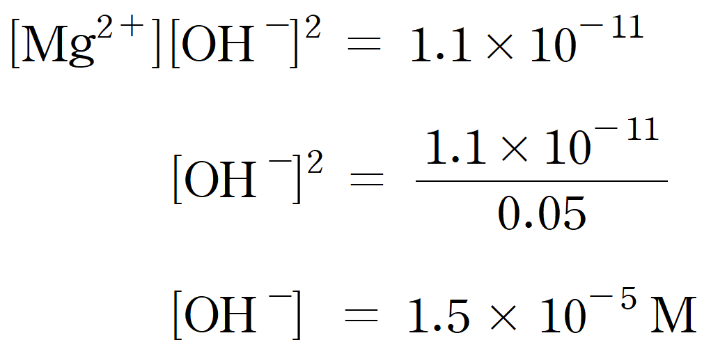 따라서 첫 번째 침전인 Mg(OH)2가 생성되기 시작하는 [OH-] = 1.5 × 10-5 M 이다. 두 번째 침전이 생성되기 시작하는 OH- 농도도 이어서 구해보면,