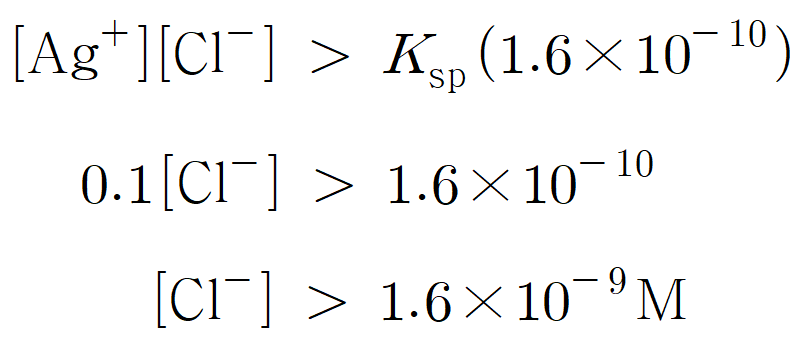 0.1 M Ag+ 용액이 AgCl 침전을 만들기 위해서는 용액 내 존재하는 이온 농도의 곱 Q = [Ag+][Cl-]이 Ksp 값보다 커야 한다. AgCl이 생기기 시작하는 Cl-의 농도는 다음과 같다.