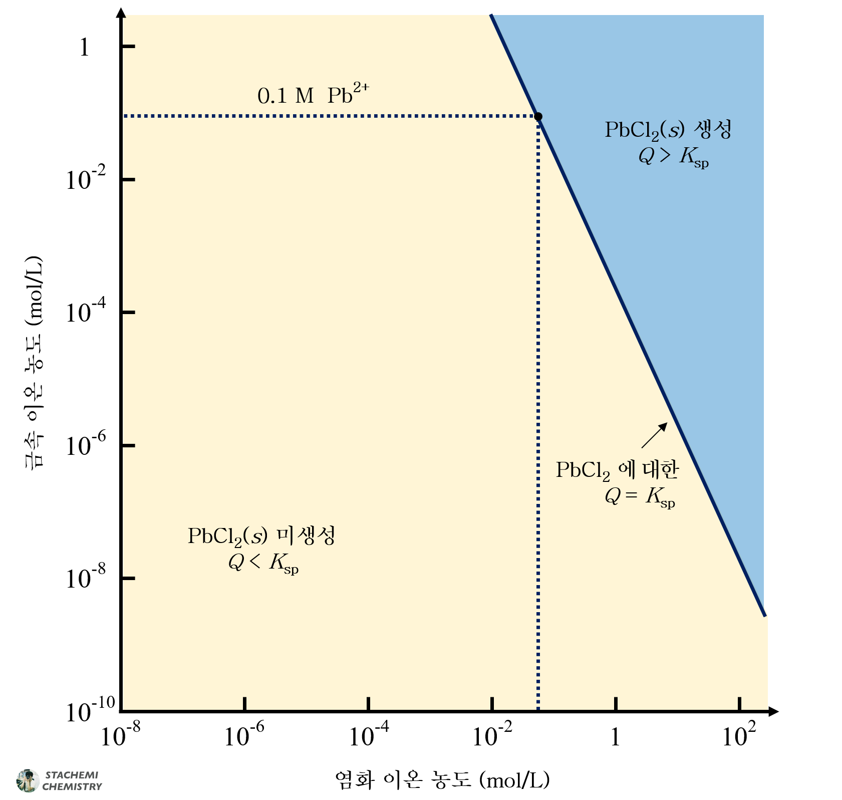 다시 말해, PbCl2가 한 톨도 생성되지 않기 위해서는 용액 내 존재하는 Pb2+, Cl- 농도의 곱 [Pb2+][Cl-]2 값이 Ksp 를 절대 넘어서면 안 된다.