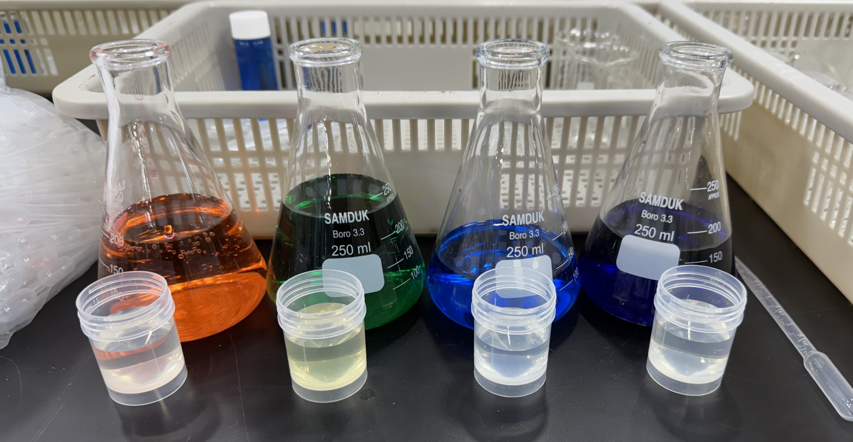 [4] (1.25% 락스 준비) 5% 락스 5 mL를 취하여 또 다른 비커에 옮기고, 물을 15 mL 첨가하여 초기 락스 농도의 1/4인 락스 용액 20 mL를 제조하여 '1.25 락스'로 라벨링 한다.