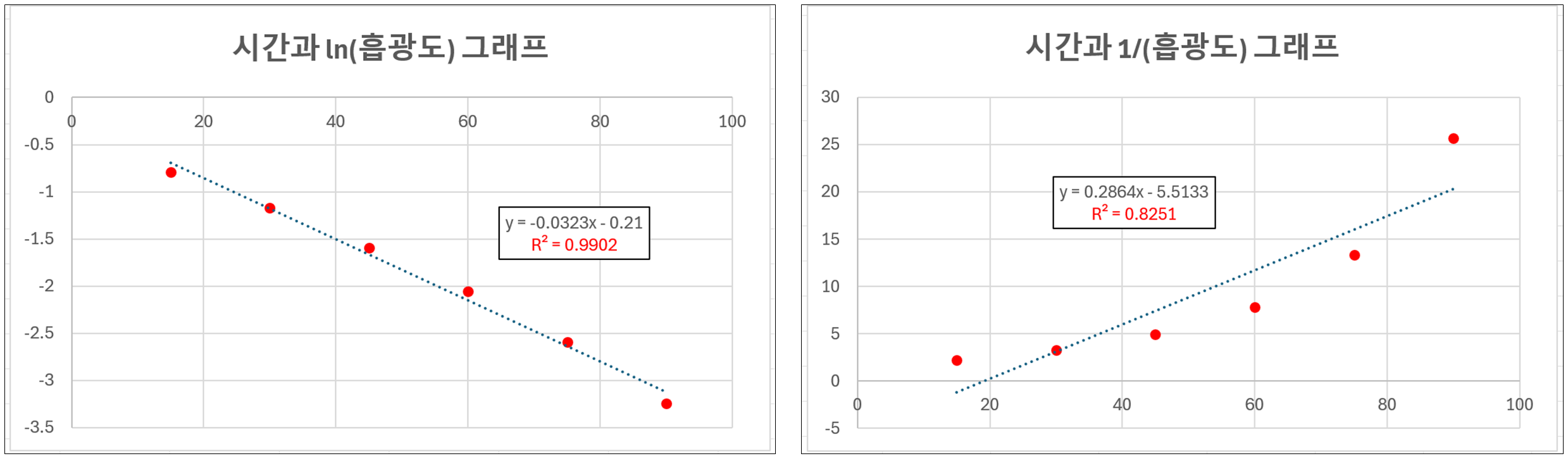 x축 시간, y축 ln(흡광도) 그래프(1)와 x축 시간, y축 1/(흡광도) 그래프(2)를 그린다. 각 그래프에 추세선(Trendline, 직선형)을 추가하고, 추세선 식(y = ax + b 형태)을 표현한다. 그려진 추세선의 R2 값은 어떤 그래프가 직선형에 가까운지 알려준다. R2 값이 1에 가까울수록 분산형 그래프의 점들이 직선형 추세선 위에 놓인다는 뜻이다.