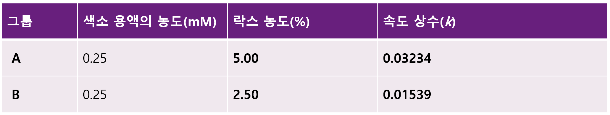 청색 색소와 락스의 속도식을 v = k [OCl-]n [Blue #1]이라 표현했을 때, 그룹 A, B, C의 [Blue #1]가 일정하고, 락스 농도는 4:2:1의 비를 가지므로, k' 값을 통해 락스(OCl-) 농도에 대한 반응 차수(n)를 결정할 수 있다.