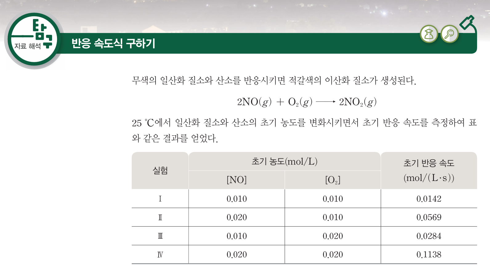 O2 농도가 0.01 M로 일정하고, NO 농도가 2배 차이 나는 [실험 Ⅰ, Ⅱ]의 초기 반응 속도는 약 4배 차이가 난다. 이를 통해 반응 속도 v가 [NO]2 에 비례함을 알 수 있다. 또한 NO 농도가 일정하고, O2 농도가 2배 차이 나는 [실험 Ⅰ, Ⅲ] 또는 [실험 Ⅱ, Ⅳ]의 초기 반응 속도가 약 2배 차이 나는 것을 통해 O2 농도에 대한 차수가 1차임을 알 수 있다.