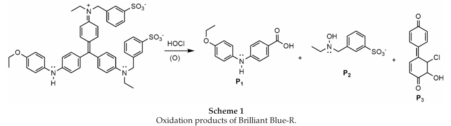 * 아래 Scheme은 단백질 염색제로 사용되는 청색 색소 중 하나인 Coomassie Brilliant Blue-R가 차아염소산(HOCl)의 반응에 의해 세 가지 분자(P1, P2, P3)로 분해되는 과정을 보여주고 있다. 해당 논문에서는 NMR, GC, MASS 등을 이용하여 세 가지 분해 생성물을 확인했으며, 세부적인 메커니즘도 함께 제시하였다(S. Nadupalli et al., 2015).