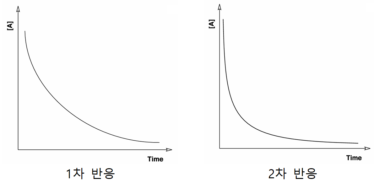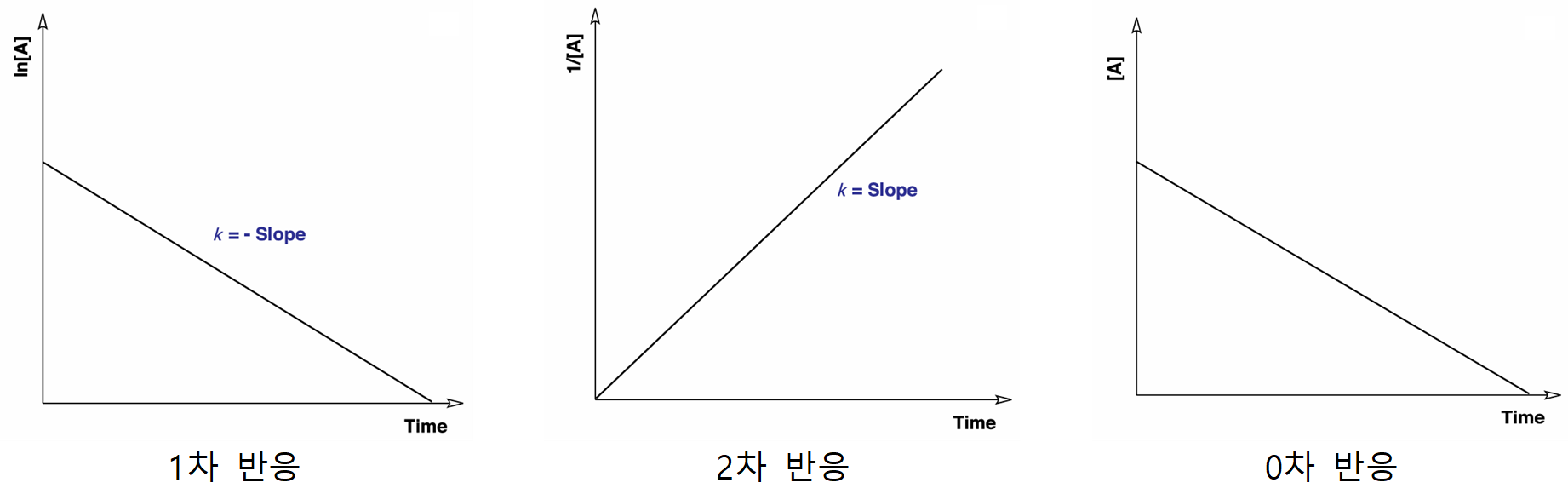 1차 반응은 시간에 따른 ln[A] 그래프가 직선형이며, 2차 반응은 시간에 따른 1/[A] 그래프가 직선형이다. 0차 반응은 별도의 농도 변환없이도, 반응물의 농도가 시간에 따라 일정하게 선형 감소하는 경우이다.
