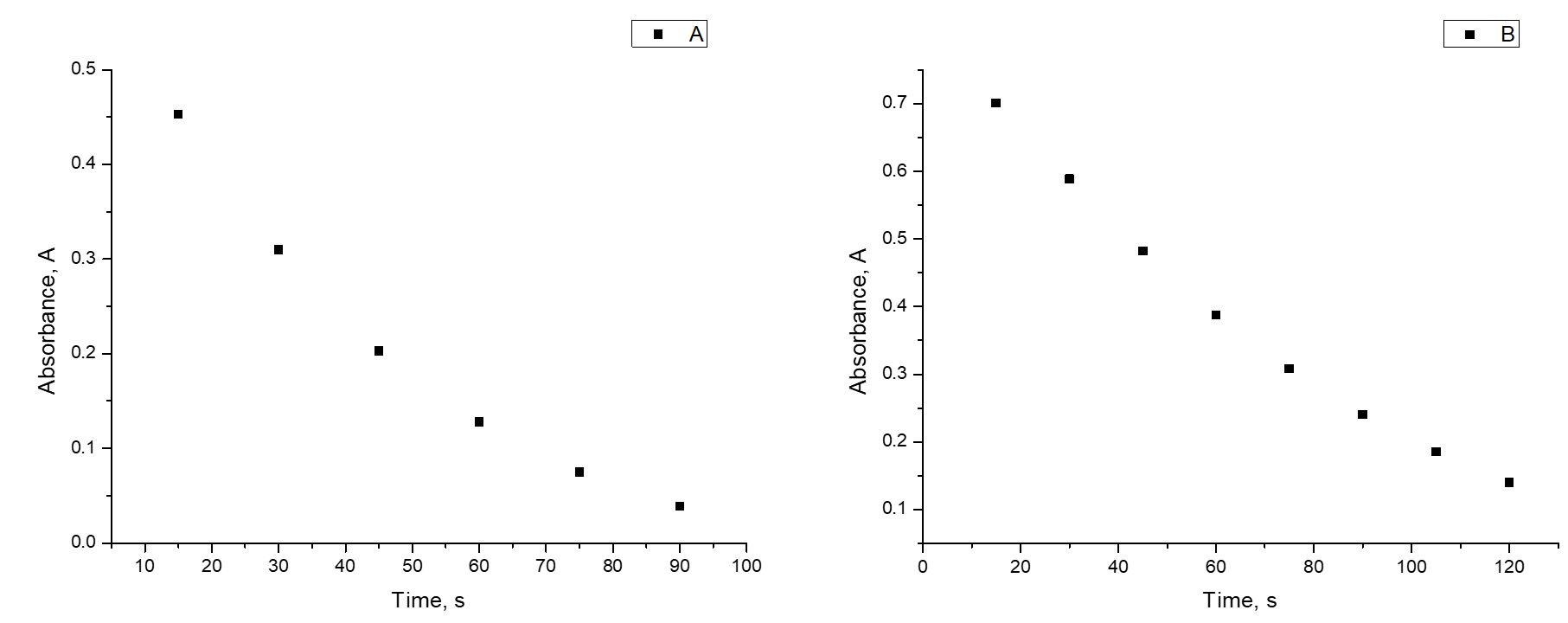 기울기는 그래프 A(=0.03234)가 그래프 B(=0.01539)에 비해 약 2배 가량 크고 가파르다. A와 B의 청색 용액 농도는 같으므로, A의 반응 속도가 B보다 2배 빠르다.