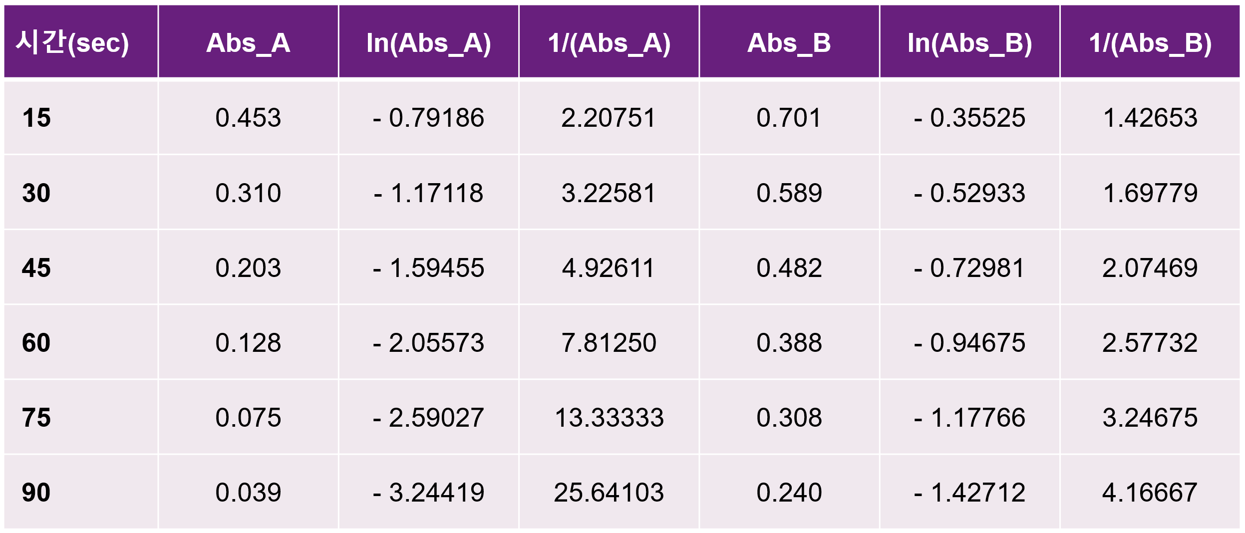 15초 간격으로 측정한 흡광도 값을 구글 시트(Google Sheet) 또는 마이크로소프트 엑셀(Microsoft Exel)으로 시간에 따라 정리한다. 그리고, 정리한 흡광도 값을 ln(흡광도)와 1/(흡광도)으로 변환한다.