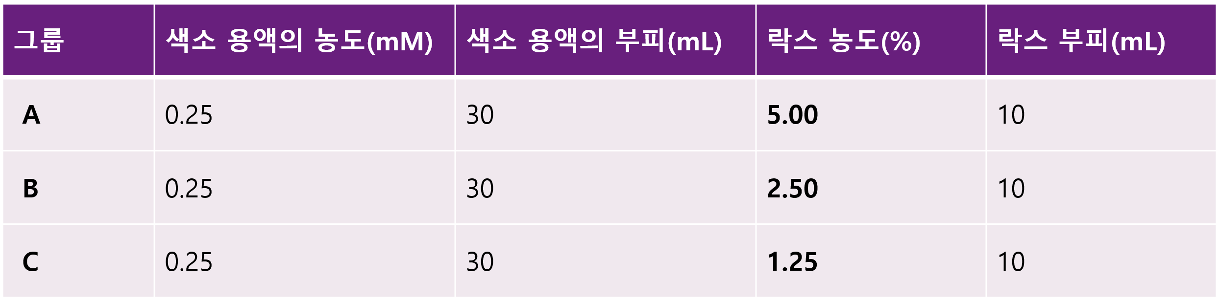 * 각 모둠별 준비된 용액은 청색 #1호 용액 100 mL, 5% 락스 25 mL, 2.5% 락스 20 mL, 1.25% 락스 20 mL 이다.