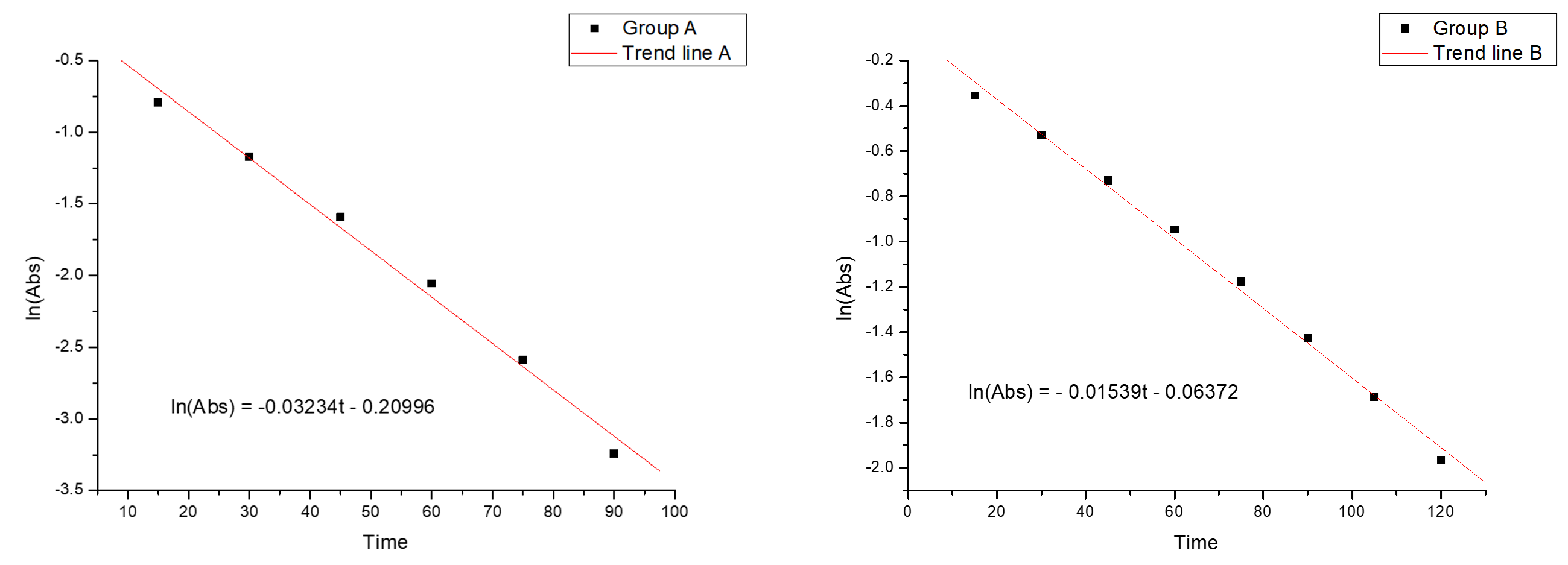 그룹 A의 ln흡광도 그래프와 1/흡광도 그래프를 비교해 보면 확연한 차이가 보인다. 좌측의 ln(흡광도) 그래프의 R2 = 0.99이지만, 우측의 1/(흡광도) 그래프의 R2 = 0.825이다. ln(흡광도) 그래프가 1/(흡광도) 그래프에 비해 선형 관계가 훨씬 뚜렷하므로, 이 반응은 [Blue #1]에 대한 1차 반응이다.