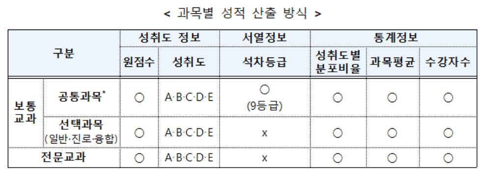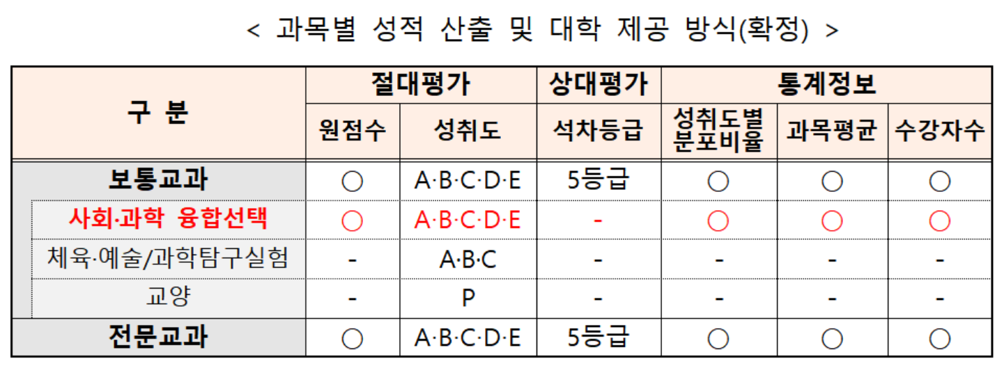 그래서 2022 개정 교육과정의 초기 내신 평가 방안에서는 선택 교과 모두 절대 평가 체제(A/B/C)로 가닥이 잡혔던 것으로 알고 있다. (성적 부담으로부터 조금은 해방시켜 주기 위해) 그렇지만, 결국 9단계 상대평가에서 5단계 상대평가로 완화된 정도로 균형을 잡았다. 완전 절대평가 체제가 갖는 여러 문제점(학교 운영의 비정상화 등)도 걱정되었을 테고, 지역별 발생하는 교육 환경 편차(고1 이후 내신각을 보다가 이탈하는 학생 분위기 등)가 생각보다 컸기 때문에 내린 결정이지 않을까 싶다.