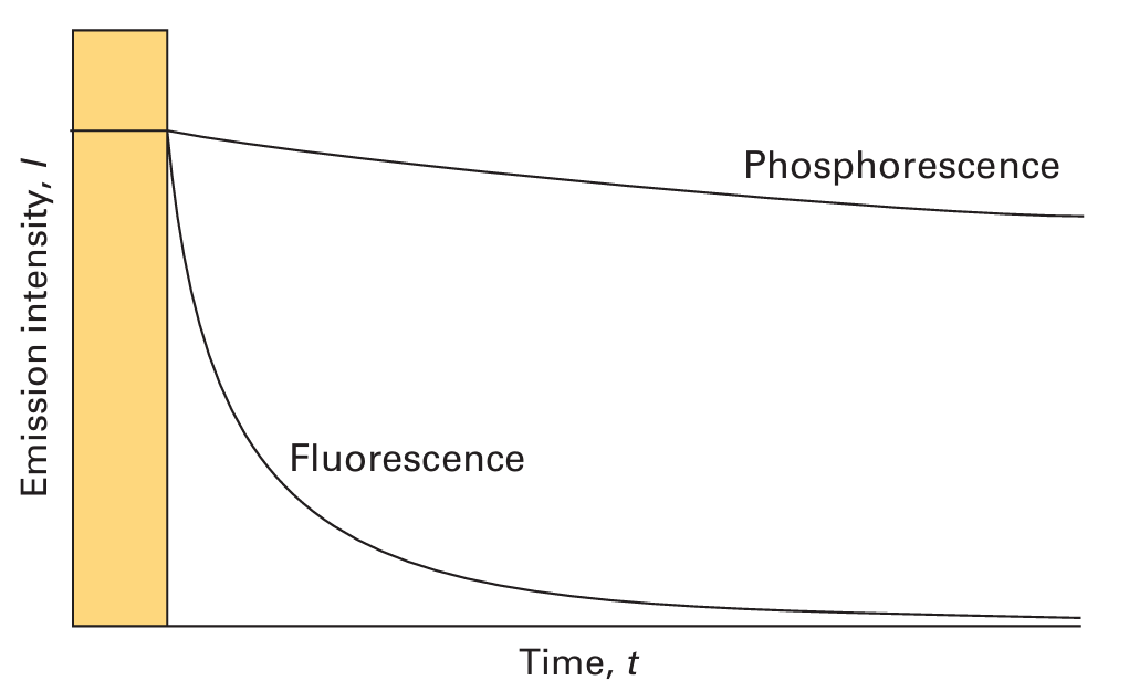 '형광'에서는 전자 들뜸에 기여한 에너지원이 제거되면, 수 나노초(ns) 이내의 짧은 시간만에 빛의 방출이 곧장 일어난다. 그에 반해 후술할 '인광'은 방출 지속 시간이 형광에 비해 장시간(마이크로초에서 수 초내(μs ~ s)) 지속가능하다는 점에서 차이가 있다.