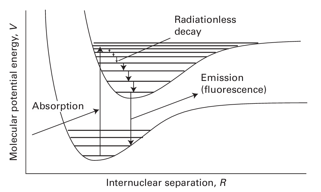 이후, 들뜬 상태(S1)의 분자는 비복사 감쇠(Radiationless decay, 진동 이완) 과정을 거쳐 들뜬 상태의 최저 진동 준위(S1')에 도달하게 된다. 그리고 이 들뜬 상태의 최저 진동 준위(S1')에서 바닥 상태(S0)를 향한 수직 전이(↓)가 발생하는데, 빛의 형태로 에너지를 방출하는 이 과정을 형광(Fluorescence)이라 한다.