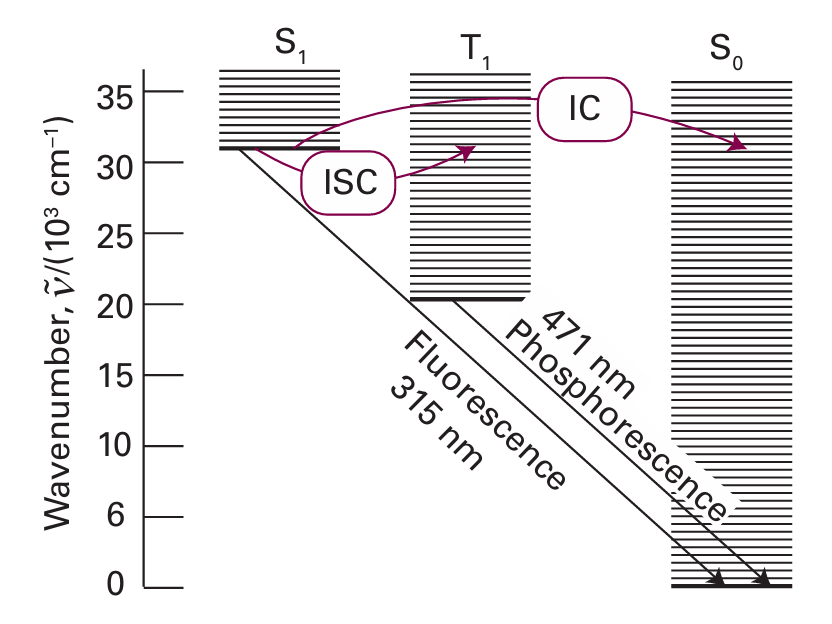 그런데, 들뜬 상태에서의 계간 교차(S1 → T1)와 들뜬 상태의 최저 진동 준위에서 바닥 상태로의 전이(T1' → S0)는 스핀 금지 전이이다. 두 과정 모두 스핀 다중도의 변화(S=1 ↔ S=3)를 수반하며, 이는 일반적인 상황이라 볼 수는 없다.