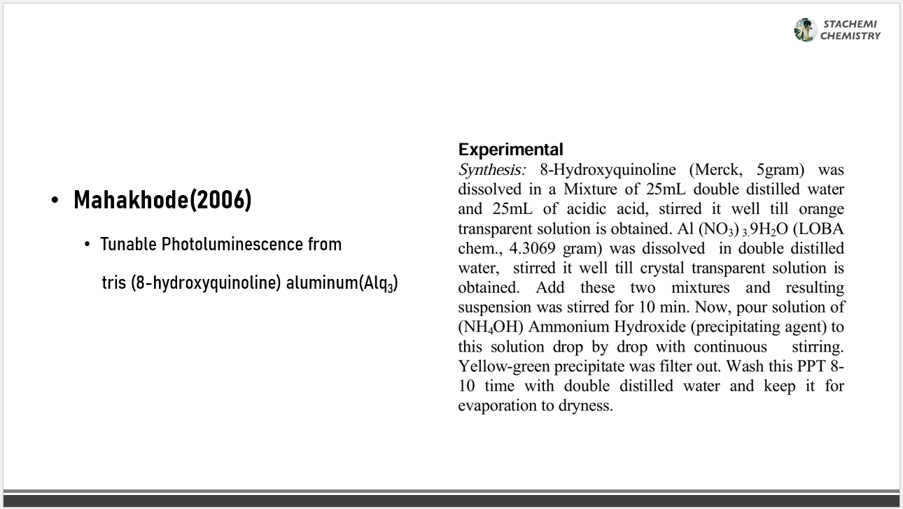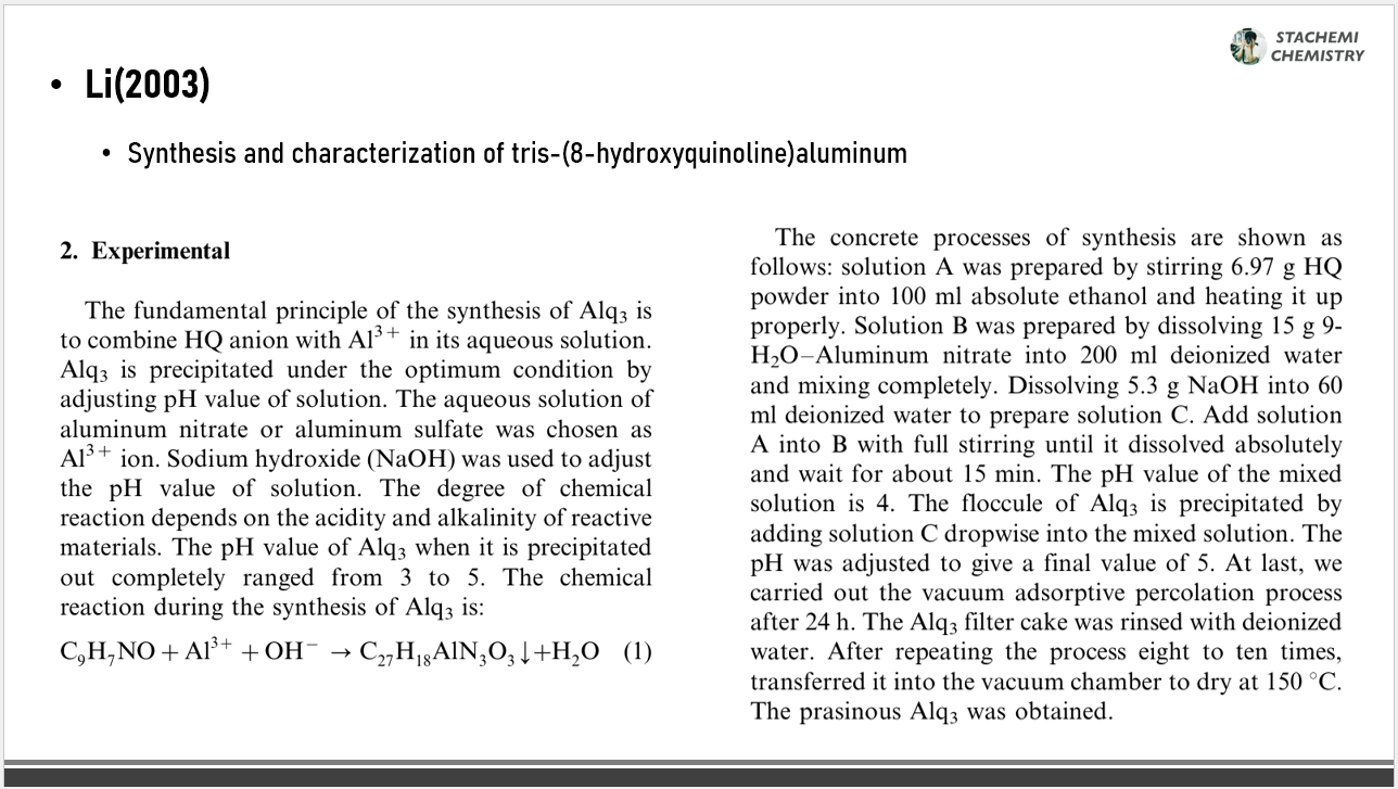 그래도 누군가는 관심이 생겨 한 번쯤 합성해보고 싶을 수 있기 때문에, 학생들과 과제 연구 당시 참고했던 논문 몇 개로부터 합성법을 옮겨본다. 약간의 차이는 있지만, 결국 알루미늄 이온(Al3+)을 물에 녹이고, 8-HQ도 적절한 용매에 녹인 뒤, 약 1:3의 몰비로 혼합시킨 뒤, pH를 천천히 높여 침전물의 형태로 Alq3 착물을 얻어내는 전반적인 과정은 유사하다.