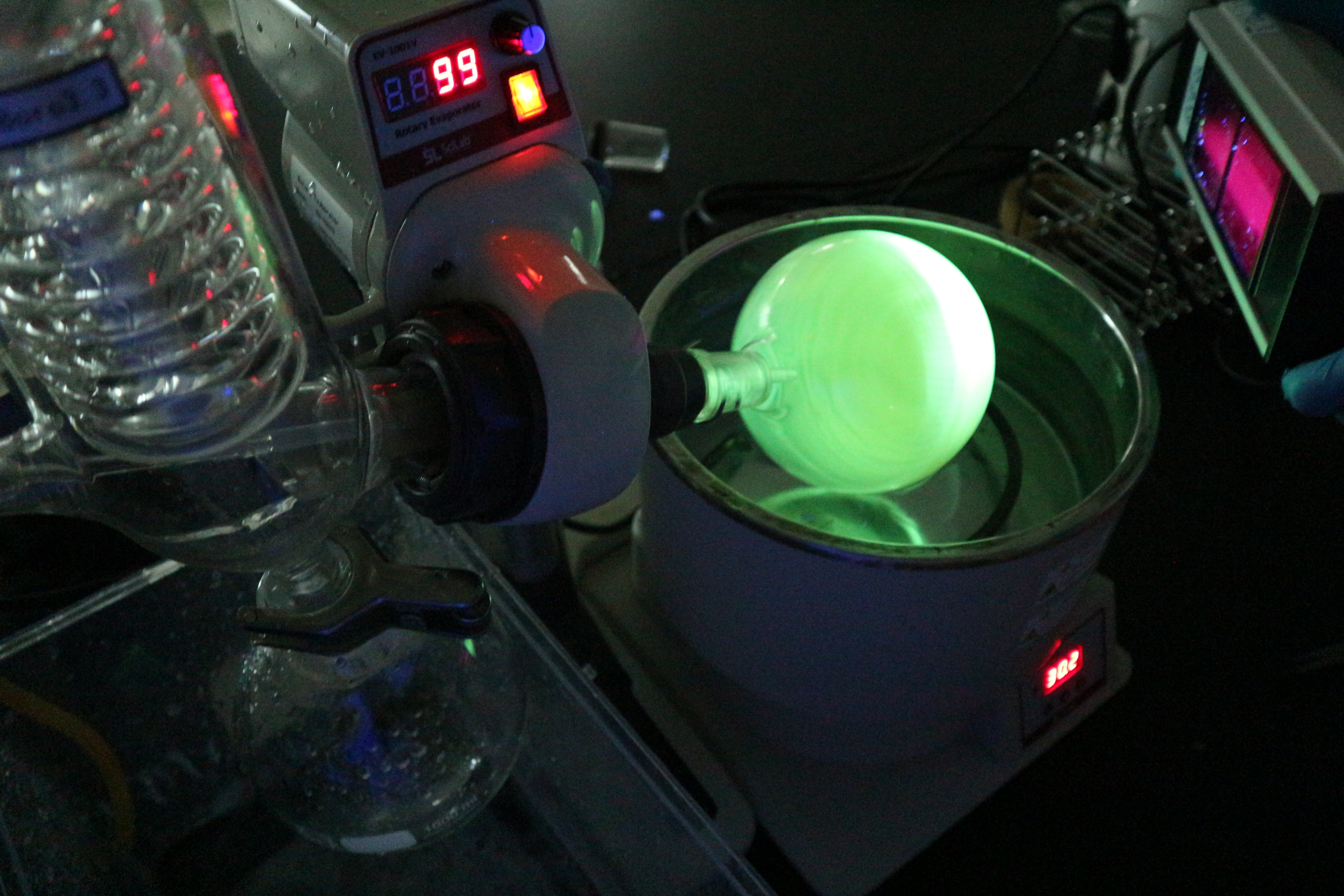 다만, Alq3가 물에 잘 녹지 않고, 쉽게 발광한다는 특성이 있기 때문에, 반응을 마친 후, 사용한 유리 기구들을 유기용매(아세톤 등)를 이용하여 깨끗하게 세척하지 않고 제때 정리하지 않는다면, 실험실 곳곳이 얼룩덜룩 노란 흔적으로 뒤덮일 수 있고, 초자류를 볼 때마다 찝찝하게 노란 얼룩이 사라지지 않고 아른거리는 듯한 기분 나쁨을 참아야 할 수 있다. (그래서 아이들에게 굳이 먼저 합성해보자고 제안해본 적이 없고, 학생들끼리 자율적으로 합성해보겠다는 것을 절대 허락하지 않는 편이다. 아세톤으로 초자류를 세척해야만 하는 상황을 만드는 것 자체가 안전상으로도 바람직하지는 않다.)