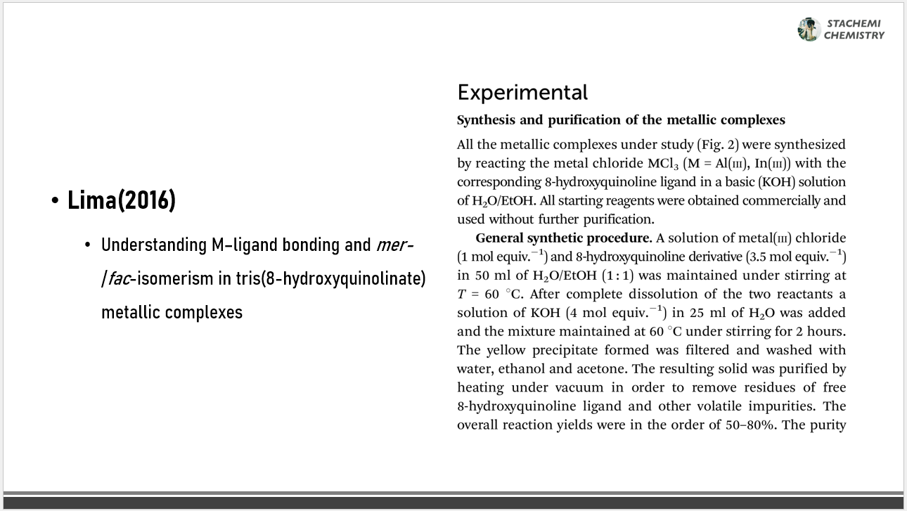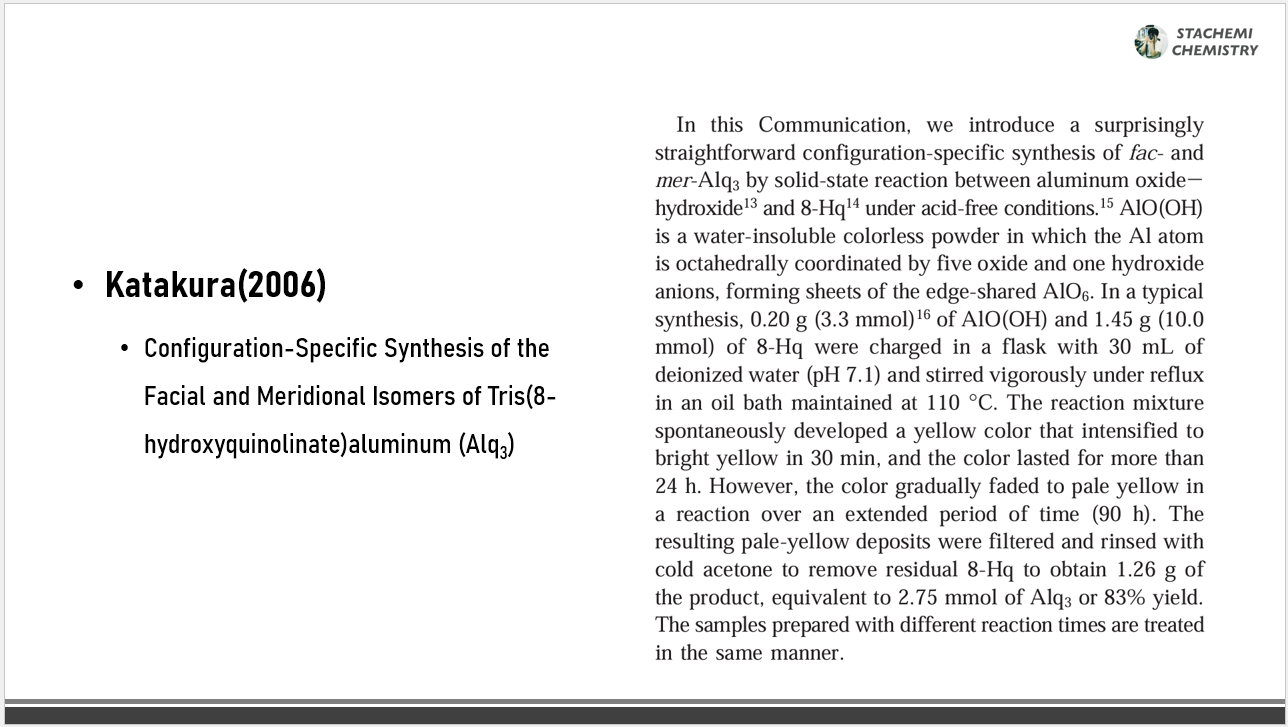 [7] R. Katakura, Y. Koide, "Configuration-specific synthesis of the facial and meridional isomers of tris(8-hydroxyquinolinate)aluminum (Alq3)", Inorganic Chemistry, 45 (2006) 5730–5732.