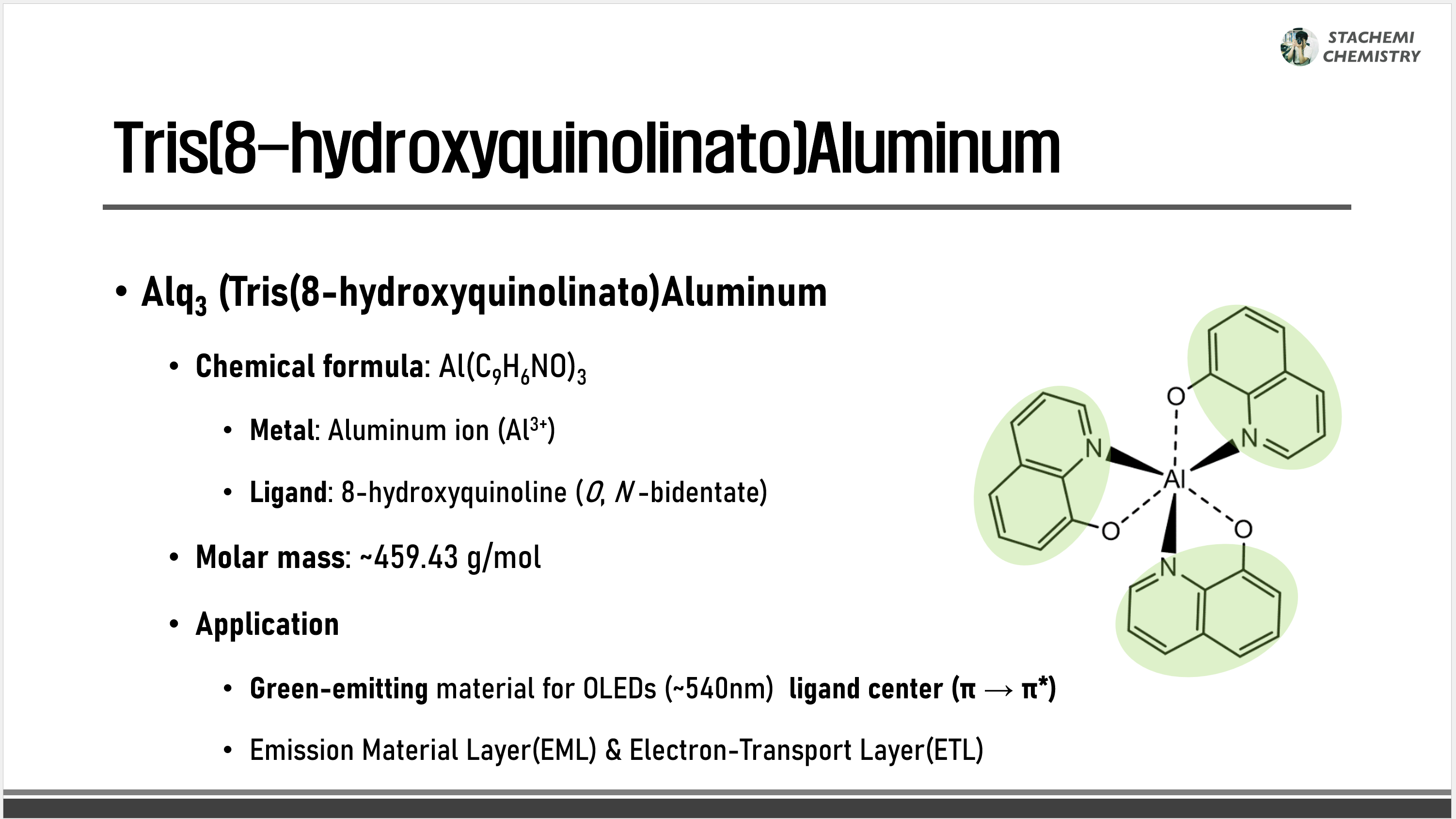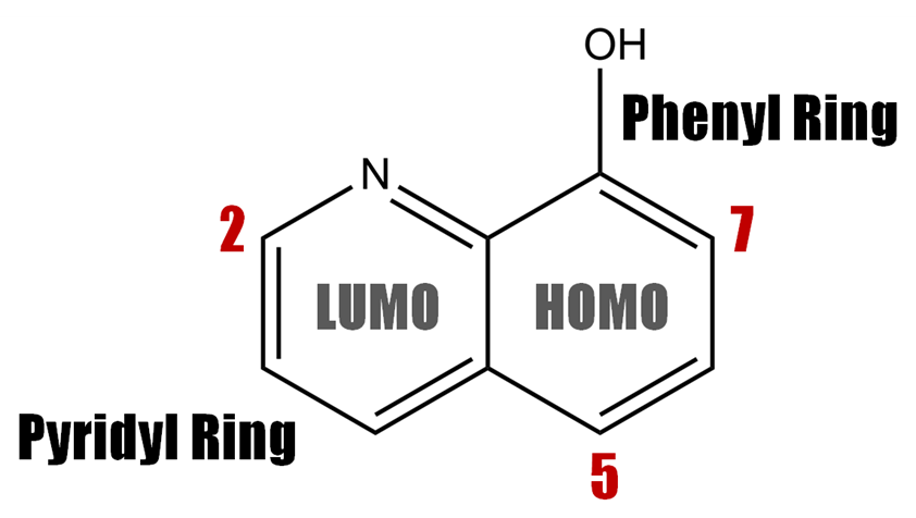 Alq3를 구성하는 리간드인 8-HQ는 두 자리 리간드로, 질소(N)와 산소(O) 방향으로 금속과 결합한다. 8-HQ는 두 개의 인접한 고리로 이루어져 있는데, 이들 각각의 고리가 착물 전체 에너지 준위에 영향을 미친다. 8-HQ의 피리딘(pyridyl) 고리는 착물의 LUMO, 페닐(phenyl) 고리는 착물의 HOMO 준위 형성에 주된 기여하는 것으로 알려져 있다(Curioni et al., 1998; Muccini et al., 2004; Iwakura et al., 2014).