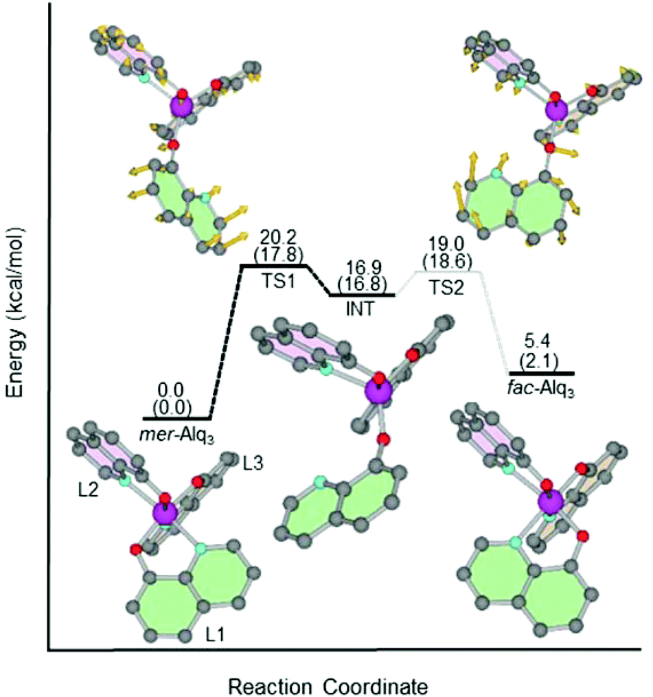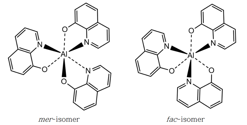 Alq3는 두 자리 리간드인 8-HQ의 산소와 질소의 배위 결합 배향에 따라 meridional과 facial의 두 가지 이성질체를 갖는다.
