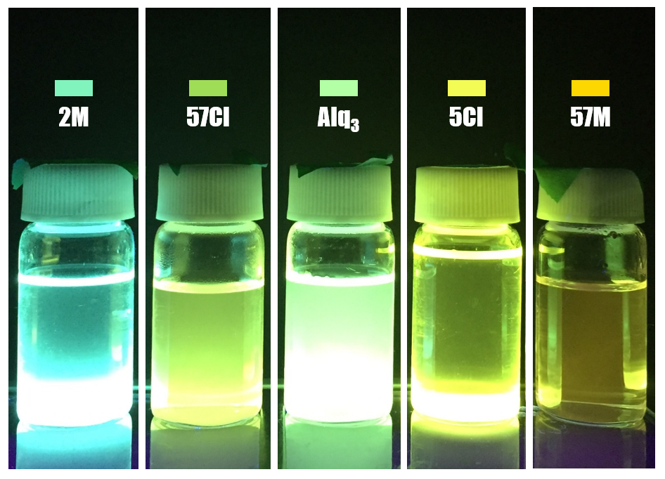 오래전이지만, 학생들과 이러한 아이디어를 바탕으로 과제연구 활동을 한 적이 있었다. (사실, 새로울 것은 없는 주제이다.) 피리딘 고리의 2번 자리, 페닐 고리의 5번 자리, 7번 자리에 몇가지 전자 끌개 그룹(EWG)과 전자 주개 그룹(EDG)을 각각 도입한 Alq3 유도체를 합성하고, 흡수 파장의 이동을 살펴봤었다. (물론, 학교에서 직접 리간드를 설계하고 합성할만큼의 시간적, 능력적, 환경적 여건이 안되었기에 시중에 판매되던 리간드로만 진행해야 했다는 한계는 있었다.)
